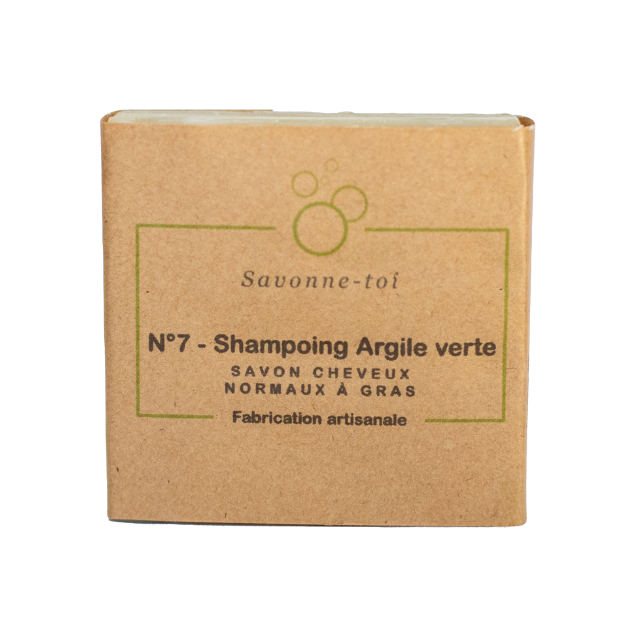 Savon shampoing pour cheveux normaux à gras à l’argile verte montmorillonite, nettoyante et régulatrice de sébum. Véritable soin pour les cheveux. Sans parfum.